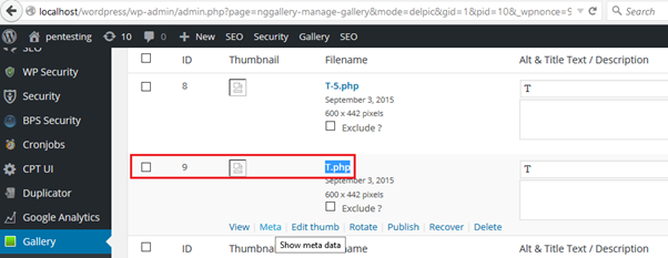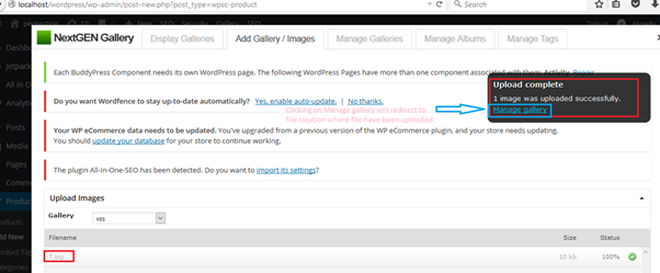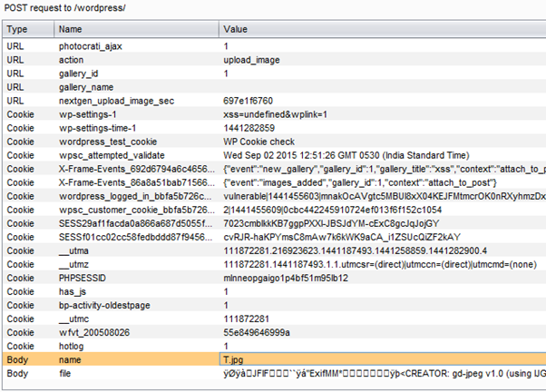 Issue 1: The Post request file and name variable in the URL http://yourwordpresssite.com/wordpress/wp-admin/post-new.php?post_type=wpsc-product is vulnerable to file upload. In which name variable extension is modified from JPG to PHP and file variable is added with PHP shell to be executed in the server which can be accessed with the help of publicly available URL http://yourwordpresssite.com/wordpress/wp-content/gallery/xss/T.php?i=1523488308