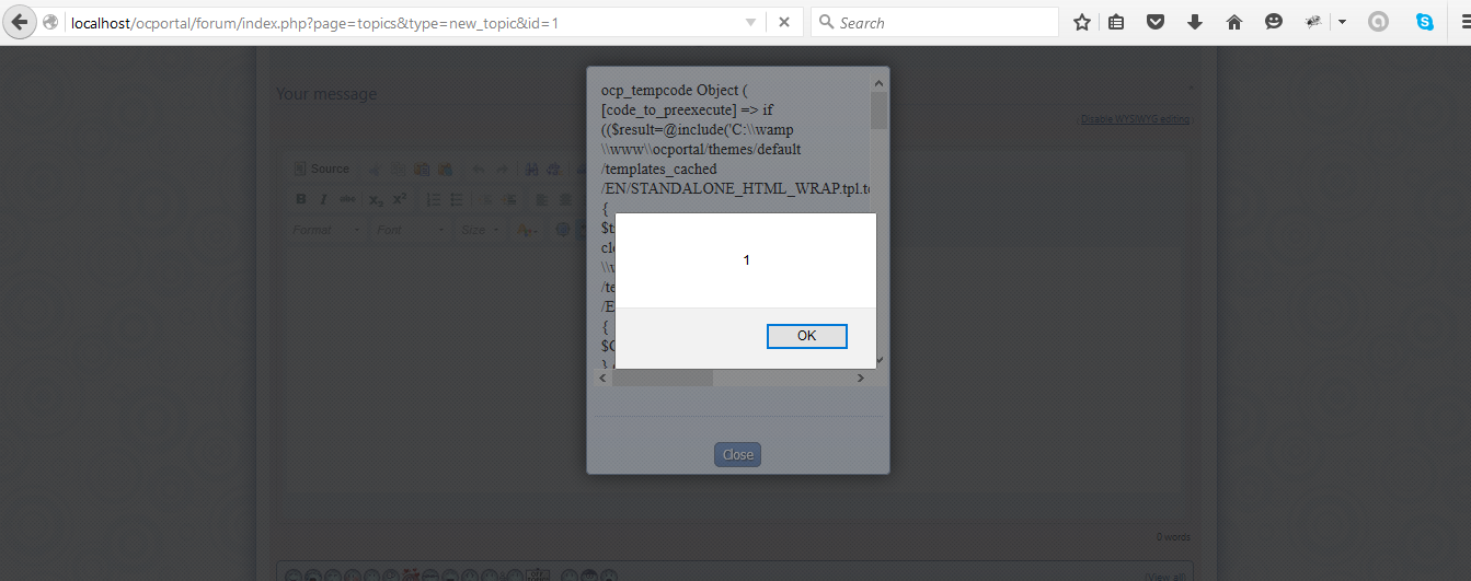 A reflected cross-site scripting vulnerability identified on OcPortal CMS 9.0.20. An input variable vulnerable to XSS is ‘field_name’ in the CF_EMOTICON_CELL.tplfile.\ocportal\themes\default\templates\OCF_EMOTICON_CELL.tpl.