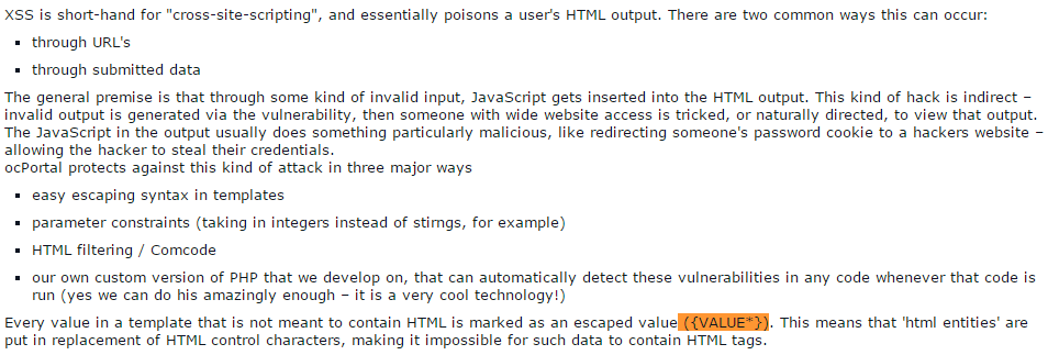 As per the documentation of the Ocportal, a value in a template that is not meant to contain HTML is marked as an escaped value ({VALUE*}). This means that ‘HTML entities’ are put in replacement of HTML control characters.