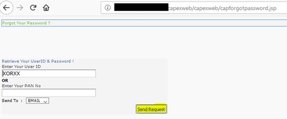 Figure-5: Forgot password page with user-id value submitted in the login page. Now, click on the send request button.