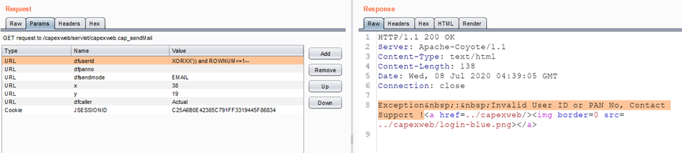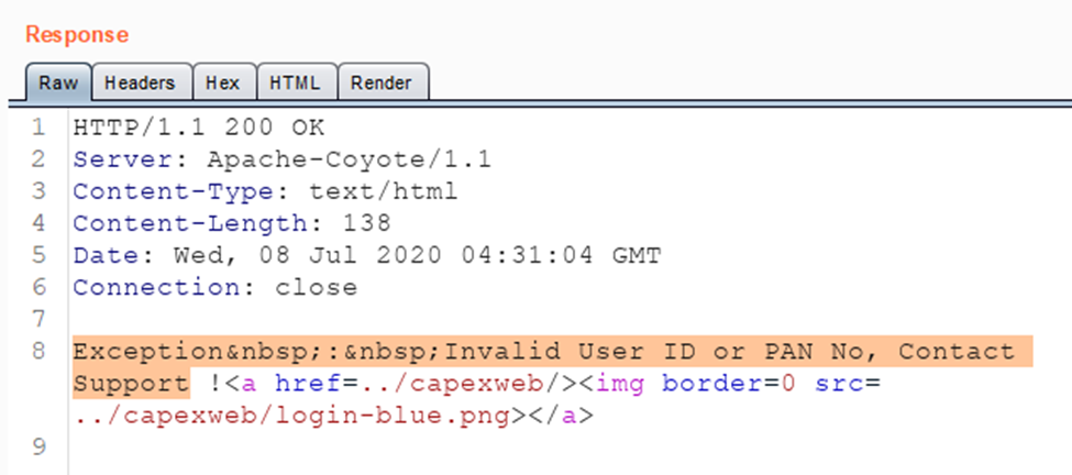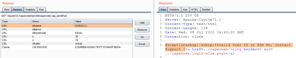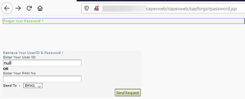 Figure-4: Response shows user-id as null if we navigate to capforgotpassword.jsp directly.