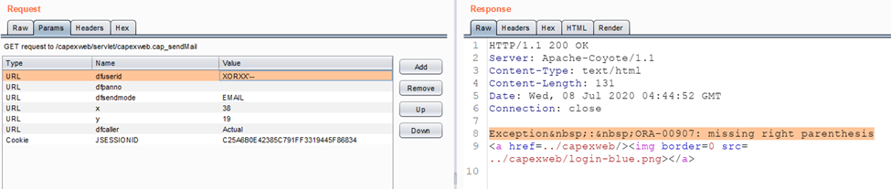 Figure-12: Replay of forgot password page with user-id value contains a single quote, right parenthesis, and comment returns missing right parenthesis error message from the database server.