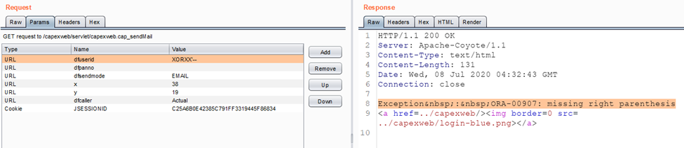 Figure-8: Replay of forgot password page with user-id value containing a single quote returns ORA string not properly terminated error message from the database.