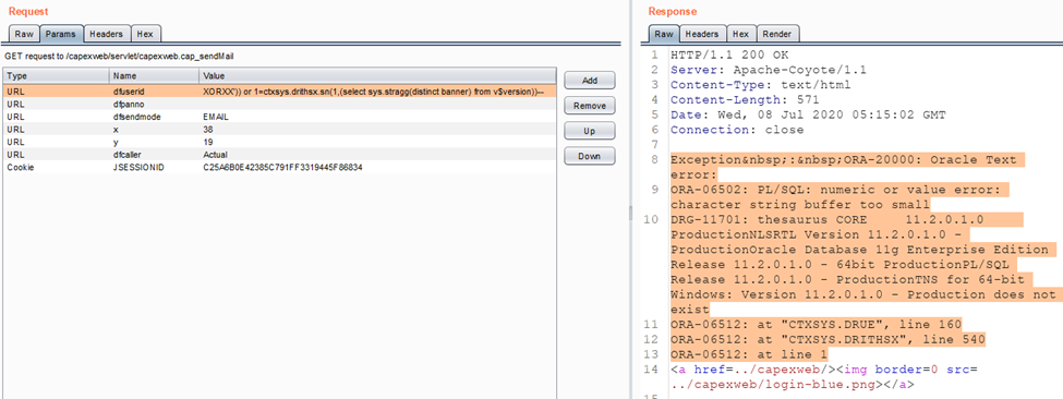 Figure-16: The payload XORXX’)) or%201=ctxsys.drithsx.sn (1, (select%20sys.stragg(distinct%20banner)%20from%20v$version))– in request to retrieve the data from the database in error information.