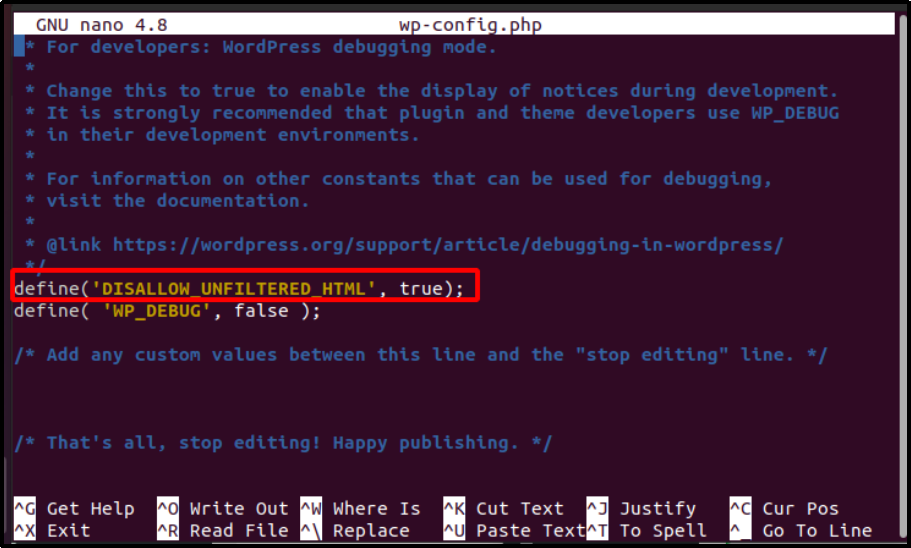 Figure 08: The default cross-site scripting mitigation setting in wp.config file to prevent cross-site scripting attacks