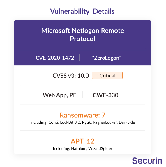 The vulnerability that was most often leveraged by Rhysida ransomware to gain access to target networks was a four-year-old flaw privilege escalation flaw in Microsoft’s Netlogon Remote Protocol, popularly referred to as ‘ZeroLogon’ (CVE-2020-1472) and was called out by Securin experts as far back as 2022, and by CISA in their KEV catalog in November 2021. The patch for the vulnerability was released in August 2020.