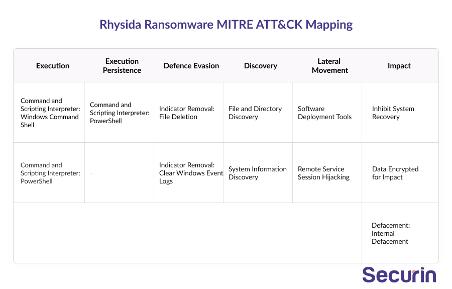 MITRE ATT&CK mapping involves aligning cybersecurity techniques and tactics with the globally-accessible knowledge base known as ATT&CK, developed by MITRE. This framework categorizes tactics, techniques, mitigations, and campaigns, offering a comprehensive view of cybersecurity threats and defenses. This is particularly relevant in the case of Rhysida ransomware, as its attack mapping helps organizations understand the specific techniques used by this ransomware group. With this information organizations not only gain insights into Rhysida’s attack techniques but also enhance their readiness and response capabilities against this specific threat and similar ones.