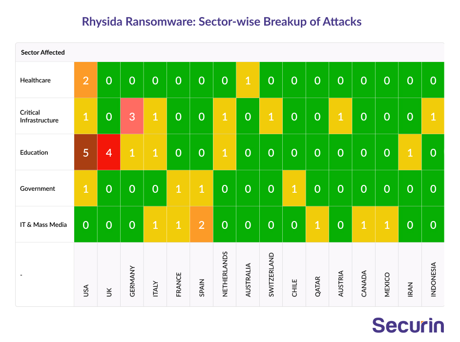 Rhysida ransomware has had a global impact, with a large concentration of incidents in North America, primarily in the USA, and a smattering of attacks in Asia, Australia, Europe and South America. The sectors most heavily targeted by Rhysida ransomware have been the Education sector, with 13 identified targets, the Critical Infrastructure and Manufacturing sector, with 9 targets, and the IT, Communications & Mass Media sector, with 7 targets.The heat map provides an insight into the workings of the ransomware group and which sectors must remain vigilant towards possible cyber incursions and therefore consolidate their weak network endpoints.By analyzing this data, businesses can prioritize their cybersecurity efforts and focus on shoring up the weaknesses in their network endpoints to better defend against potential attacks. This insight enables proactive measures to be taken, such as implementing robust security measures, conducting thorough vulnerability assessments, and enhancing overall resilience to mitigate the impact of possible ransomware attacks.