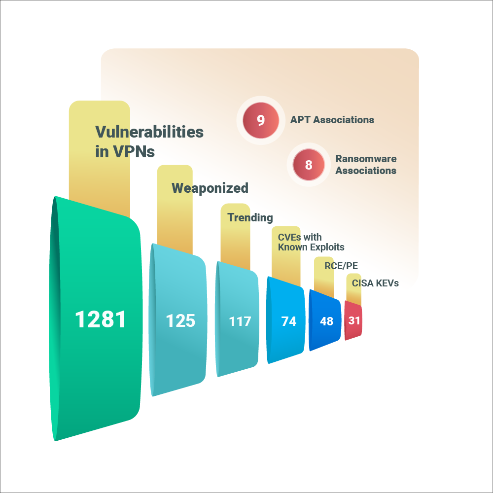 CVSS Distribution across Vendors: Our examination of the vulnerabilities across top affected VPNs brought up an interesting finding: high and medium severity vulnerabilities dominate their exposures!While it is important to address critical vulnerabilities due to their highly impactful nature, organizations would be at a loss if they ignore the high and medium severity vulnerabilities. An approach that adopts a risk perspective considering factors like ransomware and APT associations, trending factors, exploitability, the likelihood of exploitation, and CVSS severity, amongst others, will enable organizations to thwart the threats that matter to them proactively. Context is key!