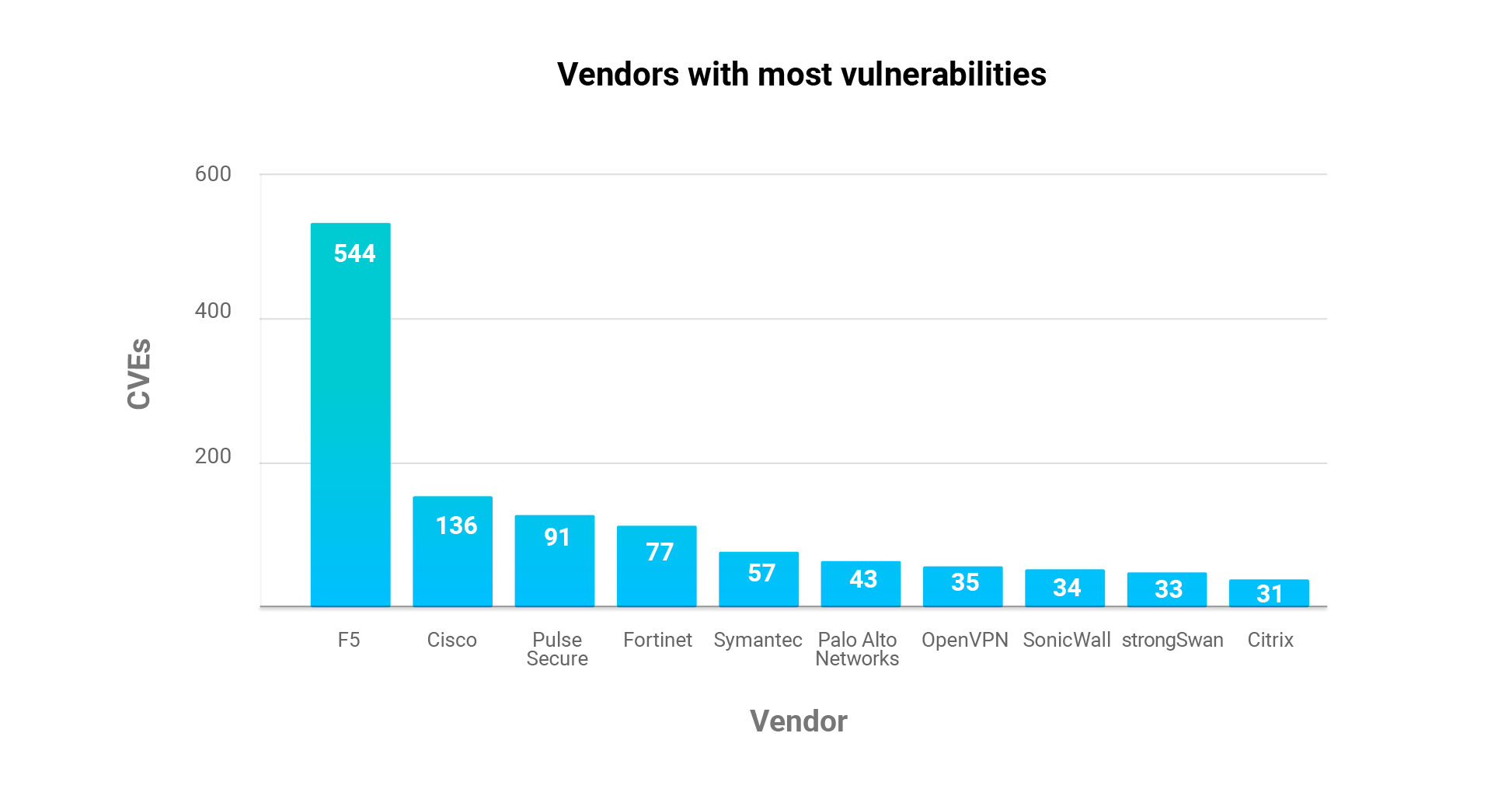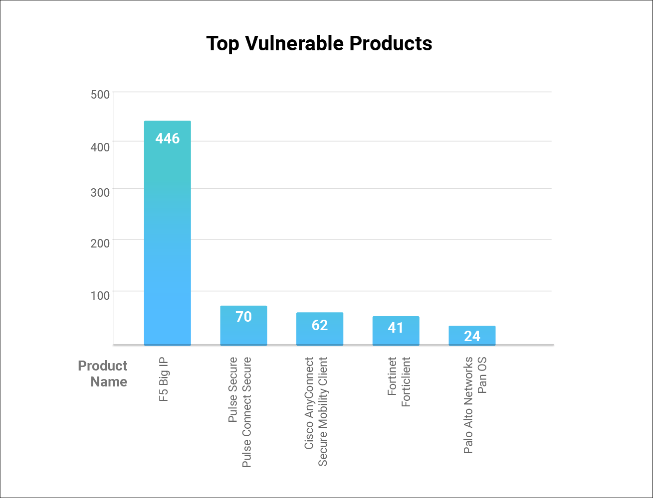 Top Products: F5 takes the cake here as well with 446 vulnerabilities in its Big IP product. Pulse Connect Secure from Pulse Secure and Cisco’s AnyConnect are the next two on the list.