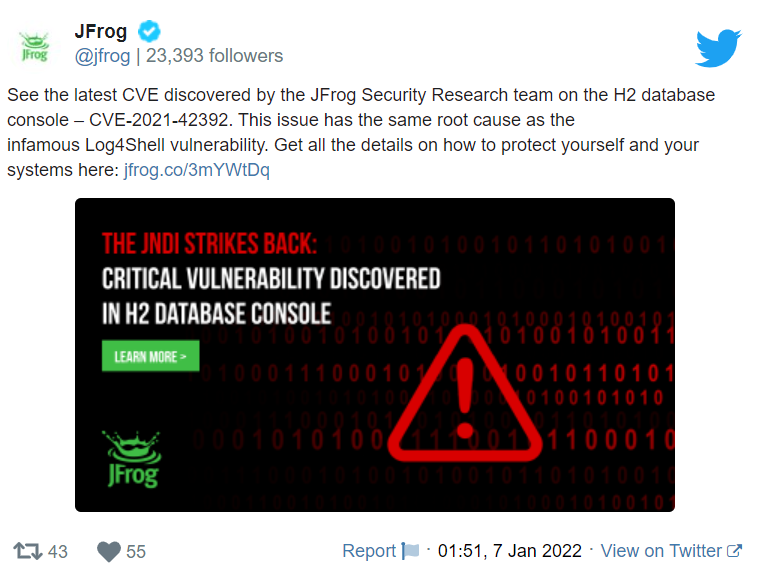 On January 07, 2022, researchers discovered a critical Java Naming and Directory Interface (JNDI) vulnerability in H2 Database Engine with a similar underlying cause as the notorious Log4j vulnerability. This vulnerability is a result of JNDI misuse that leads to unauthenticated remote code execution and is identified as CVE-2021-42392.