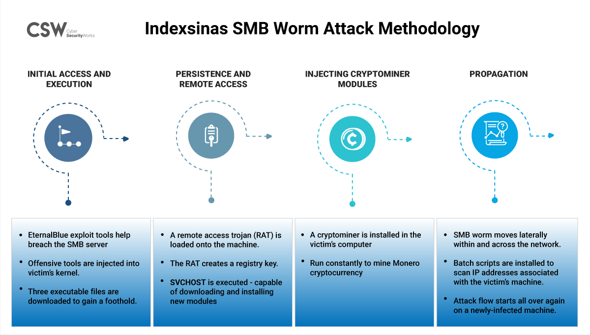 The Indexsinas SMB worm attack methodology generally consists of four different stages.