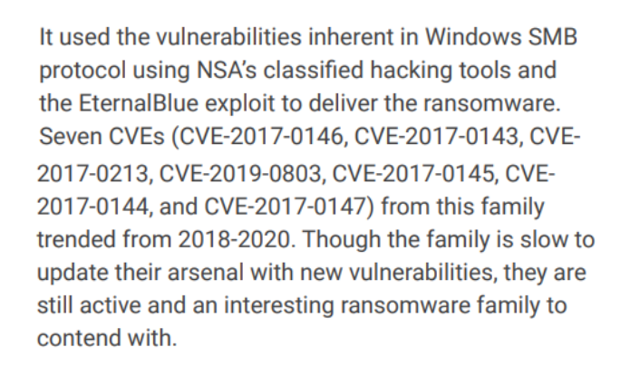 Yes, the vulnerabilities were called out by CyberSecurityWorks in the Ransomware Spotlight 2021 report, enumerating the seven CVEs as being used by WannaCry ransomware, of which five are related to the EternalBlue exploit kit.Microsoft released patches for all the vulnerabilities in 2017, covering existing versions of Windows as well as those not supported anymore. In spite of the existing patches, several thousands of devices still remain unpatched, making them prime targets for attackers.