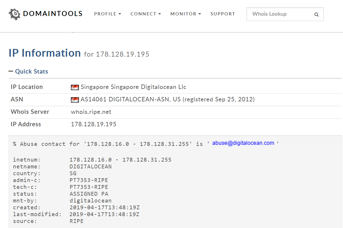 We investigated one of the URLs where the domain was redirected and found that it belonged to DigitalOcean, a cloud provider in Singapore.