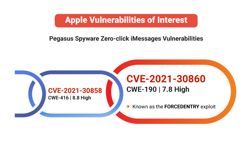 Two high severity vulnerabilities which include CVE-2021-30860, the other being CVE-2021-30858, were found trending in the wild over the last month. Interestingly, both the vulnerabilities have been linked to the infamous Pegasus Spyware zero-click iMessages attack in September 2021.