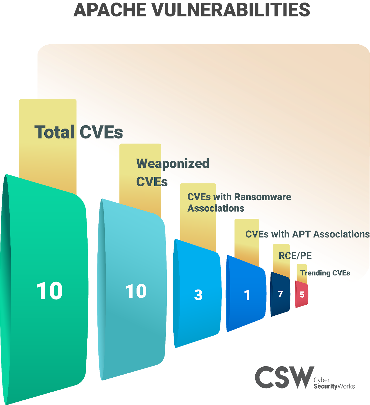 Apache appears on the Top 5 Affected Vendors list with a total of 9 vulnerabilities of which 7 have remote code execution and privilege escalation capabilities, 5 are trending in the wild, and 3 have ransomware associations.