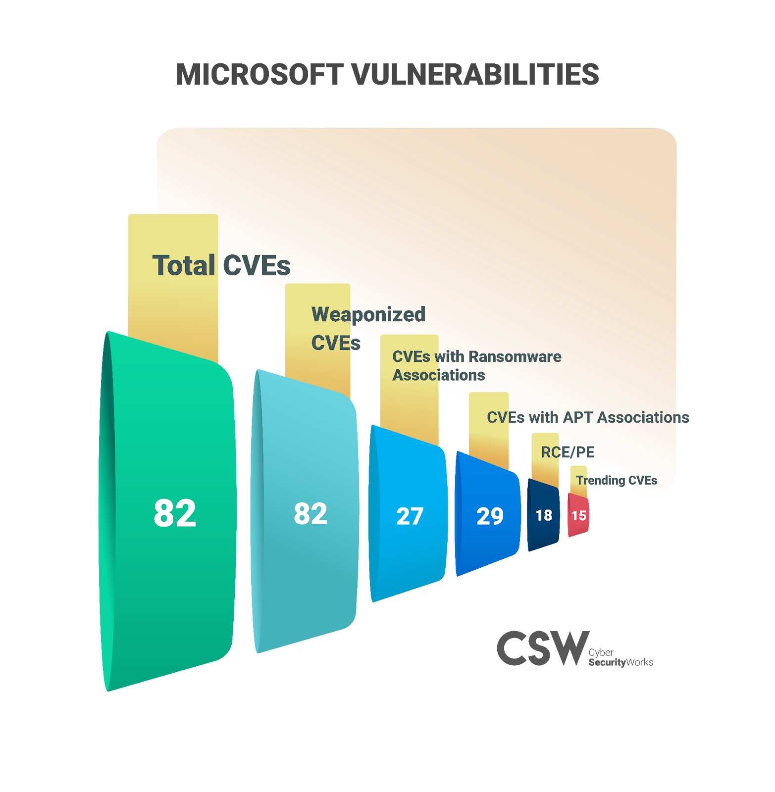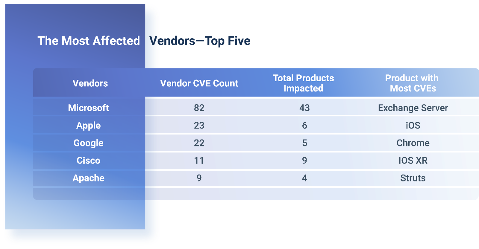 Microsoft leads the tally of most affected vendors with a total of 82 unique CVEs affecting a variety of products.