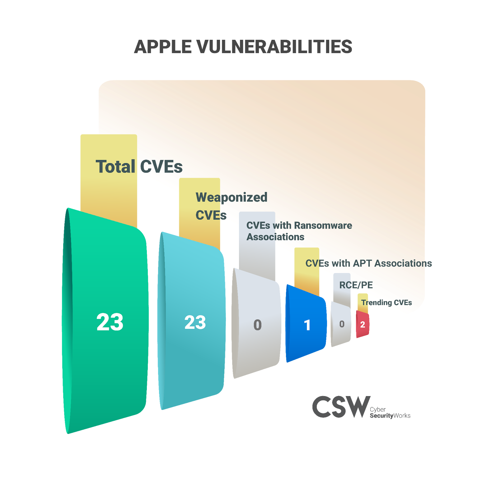 Although the number of vulnerabilities affecting Apple is far lesser than that of Microsoft, Apple still takes the position as the second worst-hit vendor with a total of 23 vulnerabilities across its products.