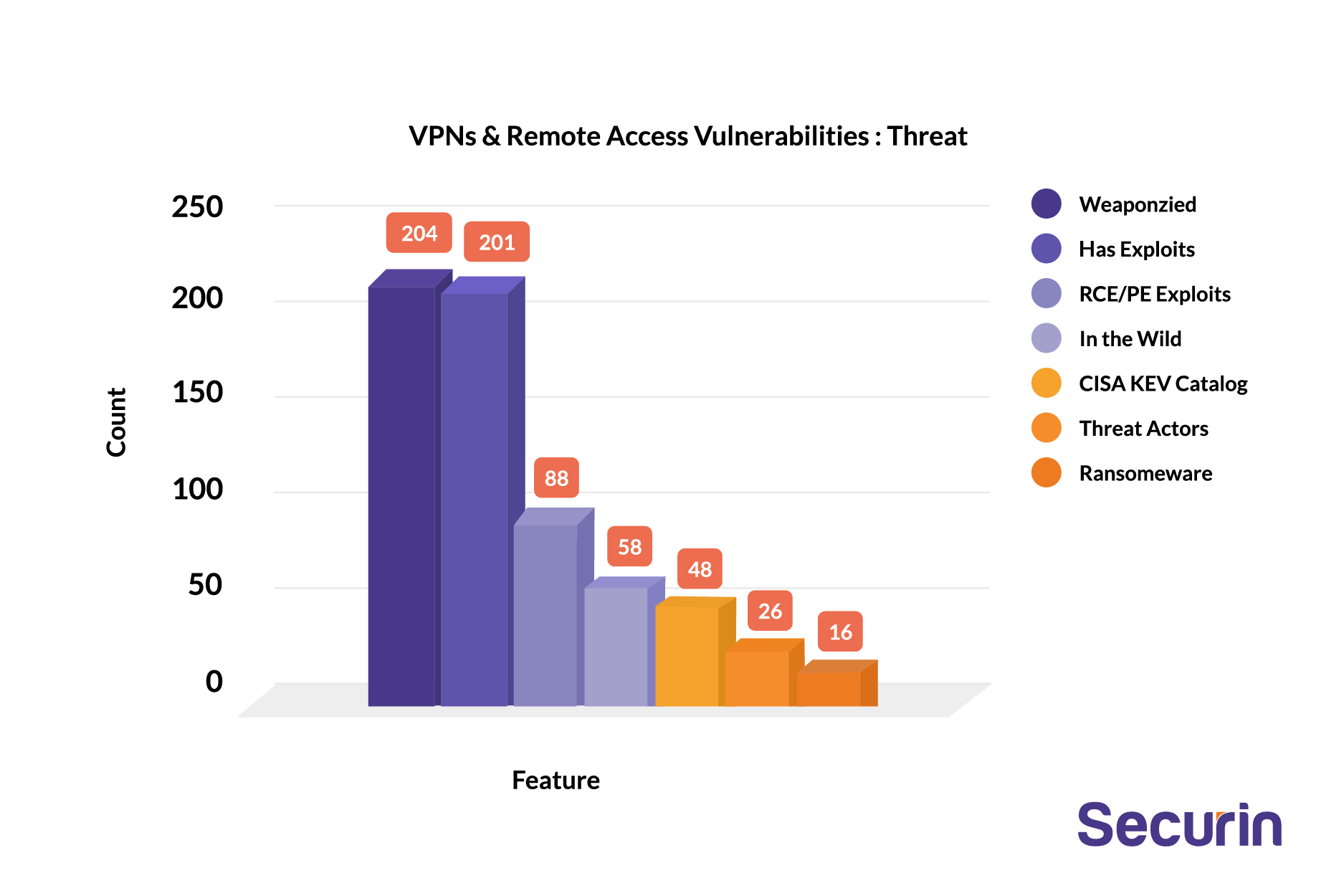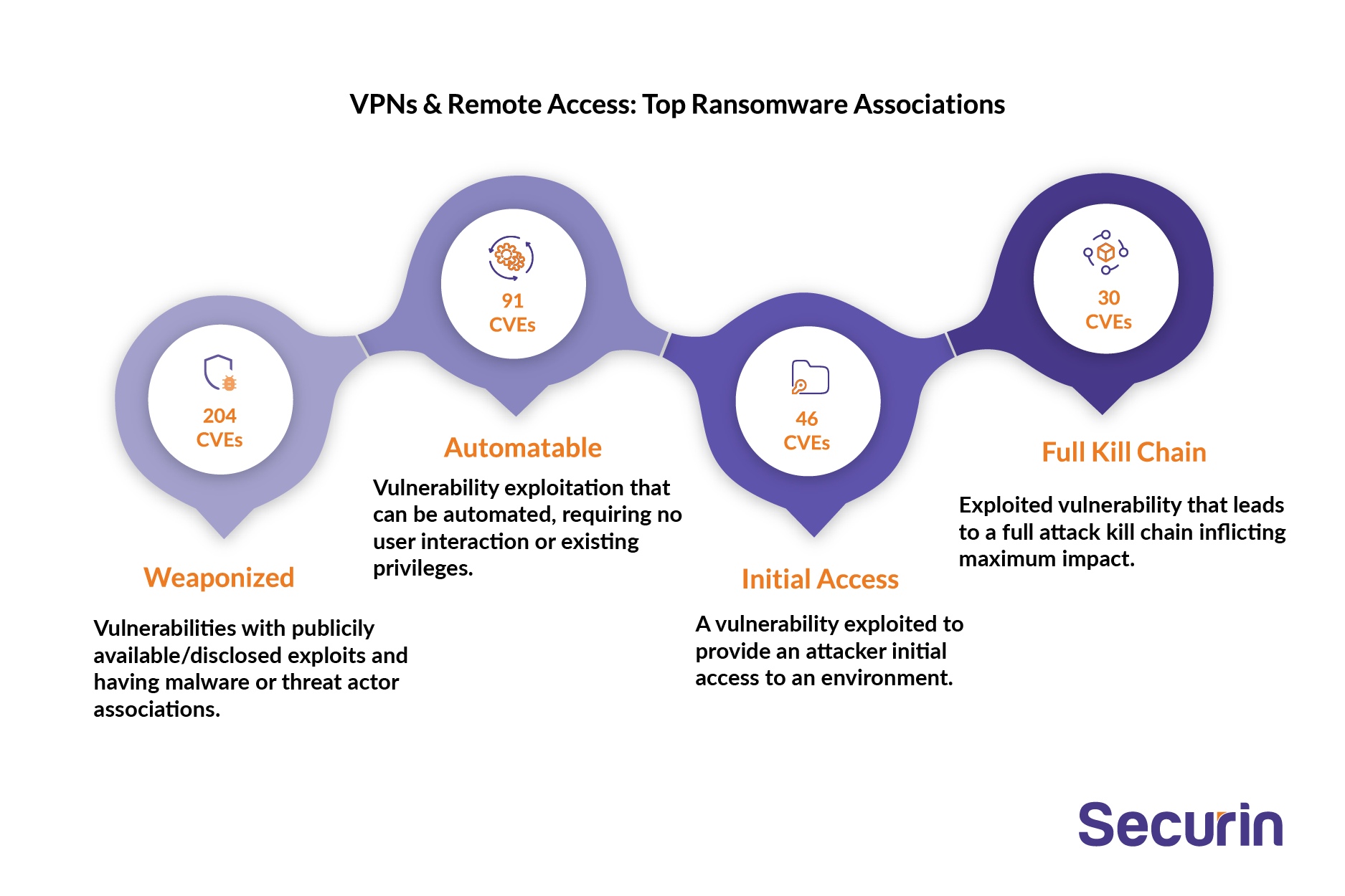 Ransomware groups, like nation-state threat actors, have wreaked havoc on VPNs through 2020 to 2024, with 7.8% of the weaponized vulnerabilities.