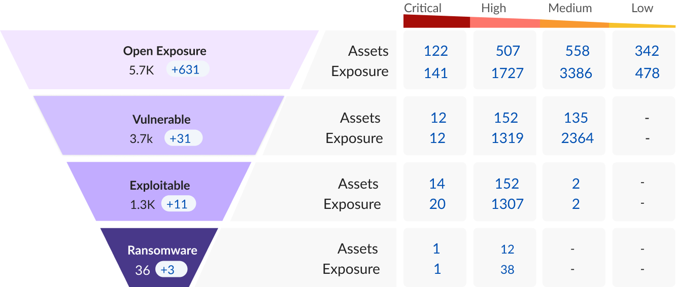 Asset criticality is assigned based on misconfigurations, vulnerable third-party software, and emerging cyberattack trends. Each exposure is analyzed and uniquely prioritized based on the severity and context in which the asset operates. Securin's platform also allows your organization to set asset criticality, thus delivering unique contextual exposure prioritization.