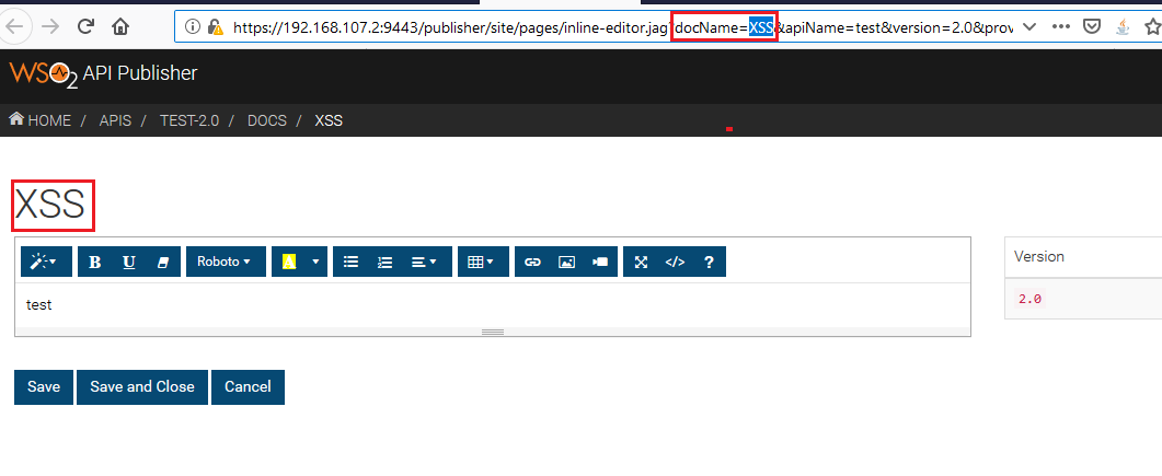 A vulnerability was discovered on WSO2 products inline API documentation editor page of the API Publisher. A reflected cross-site script (XSS) vulnerability allows an attacker to perform in the inline API documentation editor page of the API Publisher by sending an HTTP GET request with a harmful request parameter for ‘docName.’