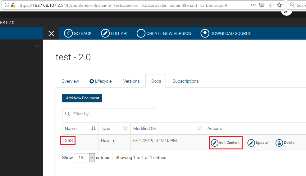 The POST request docName variable is vulnerable to reflected Cross-Site Scripting (XSS) in the URL, https://192.168.107.2:9443/publisher/site/blocks/documentation/ajax/docs.jag