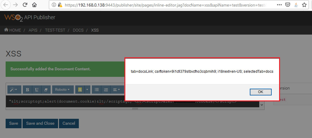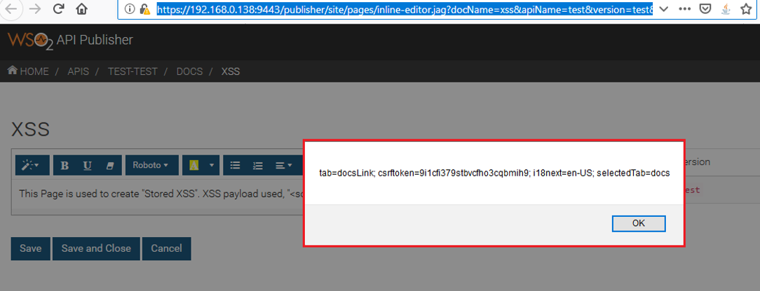 A vulnerability was discovered on WSO2 API Manager 2.6.0 in the inline API documentation editor page of the API Publisher. A stored cross-site script (XSS) vulnerability allows an attacker to inject malicious code into the inline API documentation editor page of the API Publisher when the user uses XSS payload in the code view.