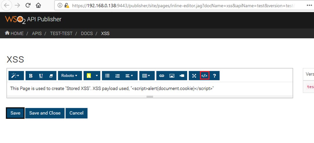 Figure 03: Use the “Save” button to save the document with the added “XSS Payload.”