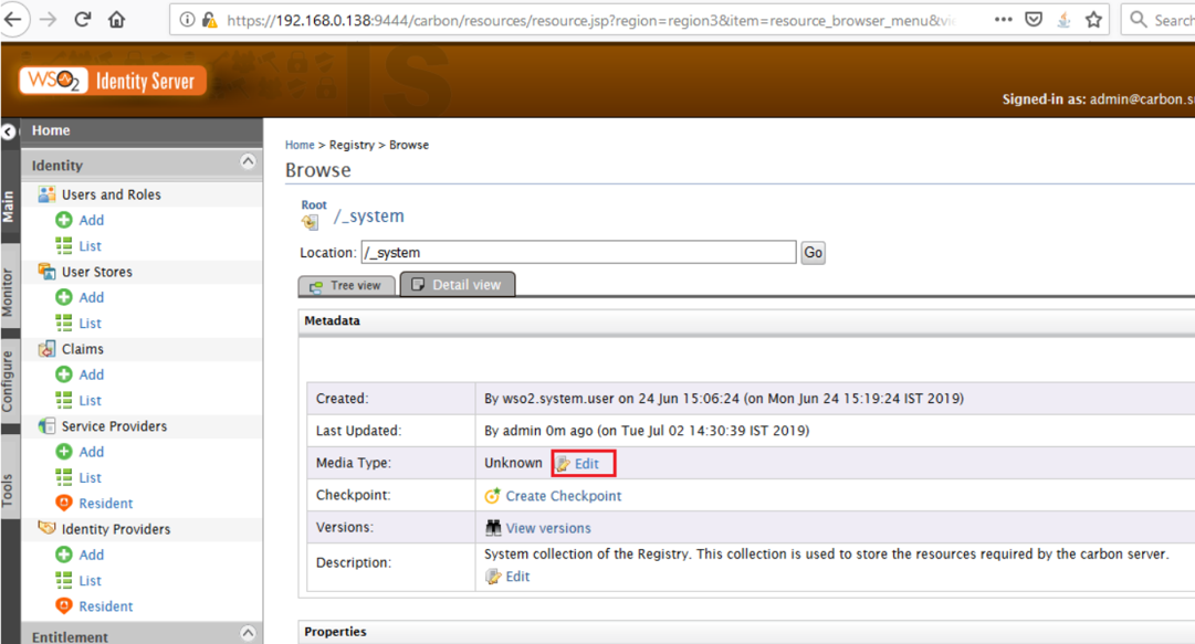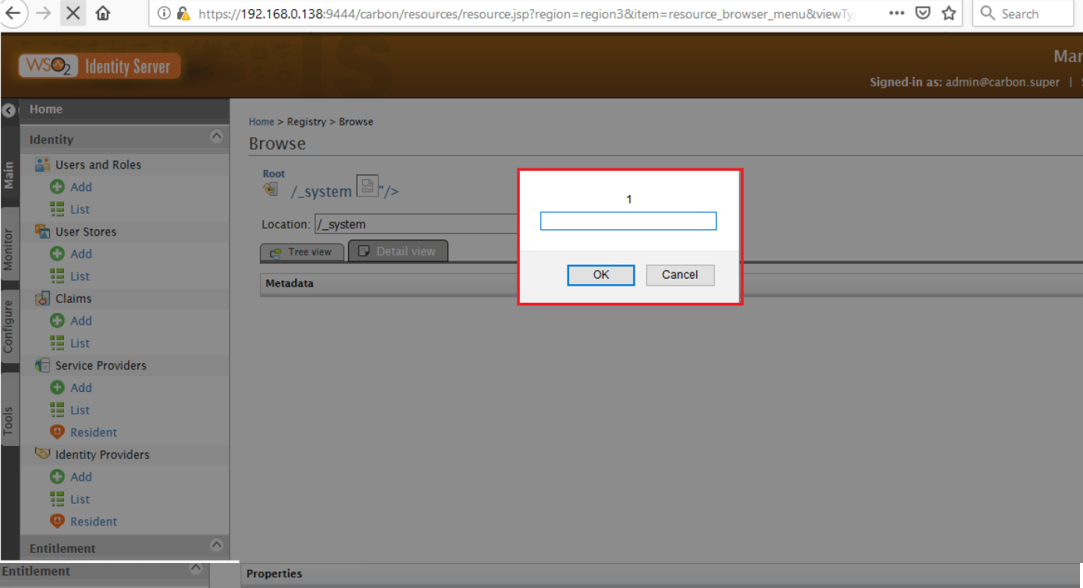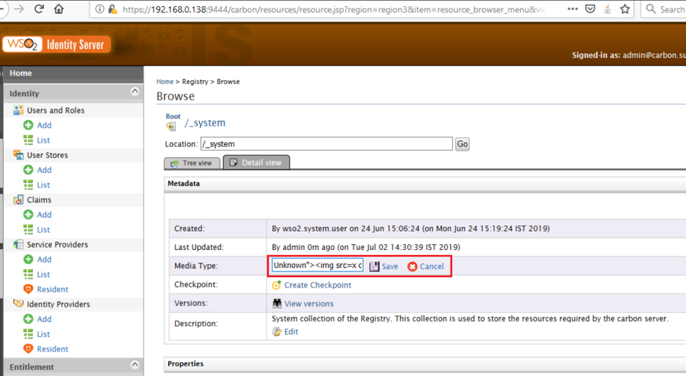 This vulnerability was discovered on the WSO2 Identity Server before 5.7.0. A stored cross-site script (XSS) vulnerability allows an attacker to inject malicious code into the application and stored in the server. An input variable vulnerable to stored XSS is ‘mediaType’ on the browser page.